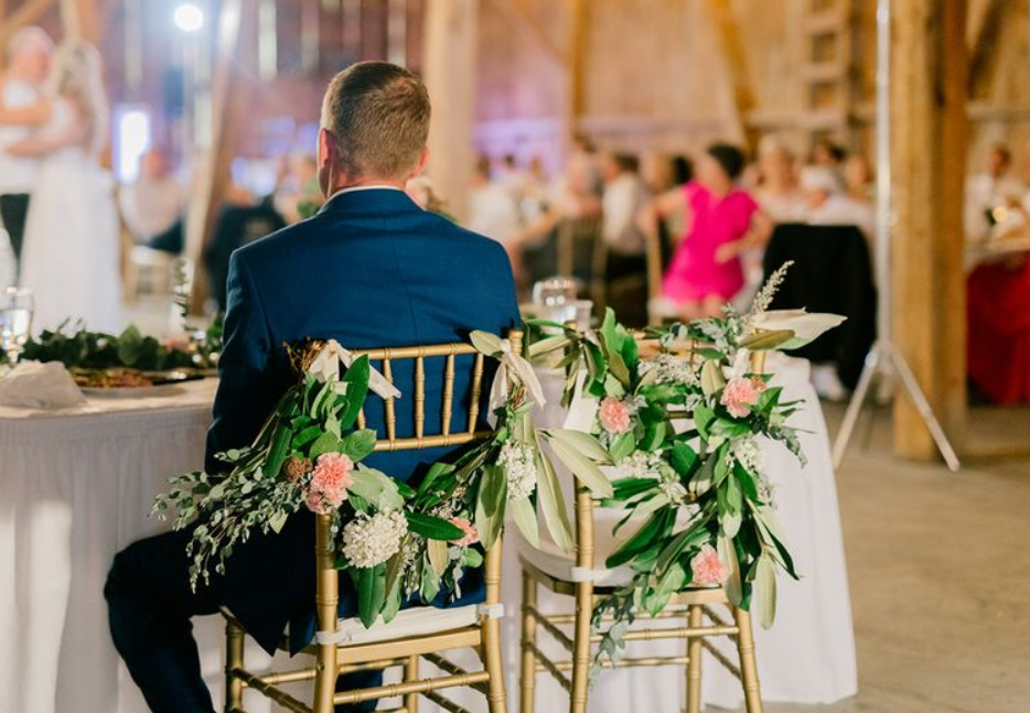 Fresh flowers are an expensive option but an elegant one for a big day. Talk to a florist to discuss the perfect way to decorate folding chairs with fresh flowers. Big blooms aren’t the best way to go here. Instead, some of the hardier greenery and filler flowers make a big impression with these setups.