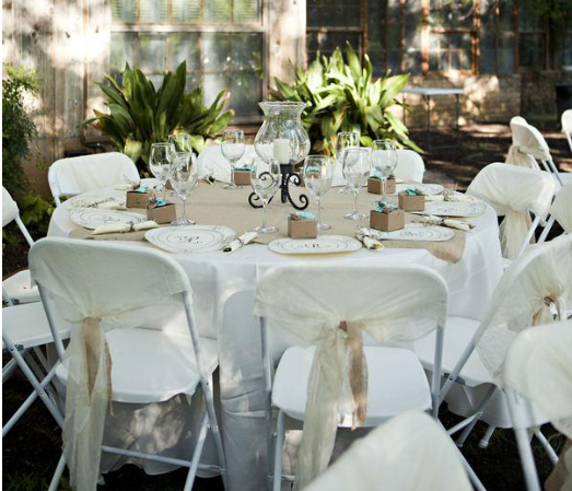 For the more rustic-inspired wedding, you can’t go wrong with the material everyone keeps raving about. No barnyard wedding is complete without copious amounts of burlap, and it’s the perfect material for sprucing up those folding chairs.