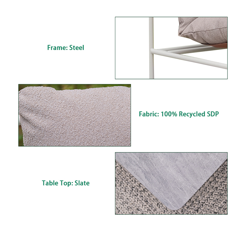 Powder-coated steel frame provides strong support and rust resistance for outdoor use. Eco-friendly recycled fabric supports more sustainable outdoor living choices. Natural slate tabletop introduces a premium, organic focal point for the patio. Complete seating group creates a comfortable lounge zone for family and guests.