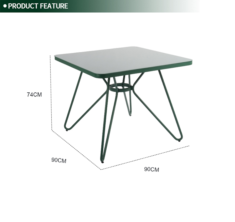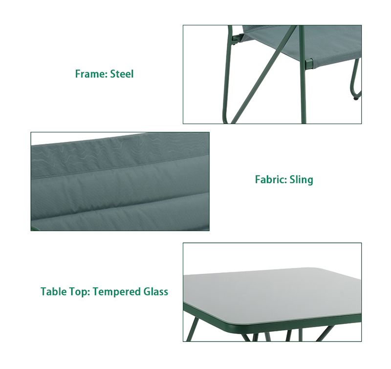 Powder-coated steel frame provides strong support and rust resistance for outdoor use. Breathable sling seating dries quickly and stays comfortable in warm temperatures. Tempered glass tabletop is smooth, safe, and easy to wipe clean after outdoor use. Space-saving dining layout is ideal for alfresco meals on patios, balconies, or gardens.