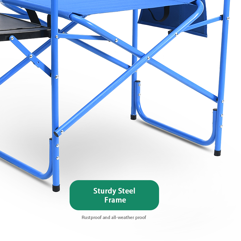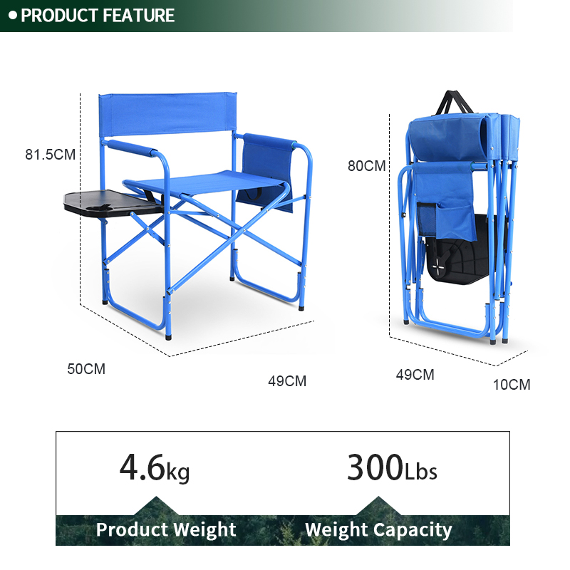 Settle in anywhere with the Heavy Duty Outdoor Portable Camping Chair Folding Director Chair With Side Table. Breathable 600d polyester oxford, powder-coated steel frame, supports up to 300 lbs for lasting comfort. Thoughtful touches include quick-fold design and compact fold. Packs into the included carry bag for grab-and-go convenience. Net weight 4.6 kg. Ideal for camping, events, patios and parks.