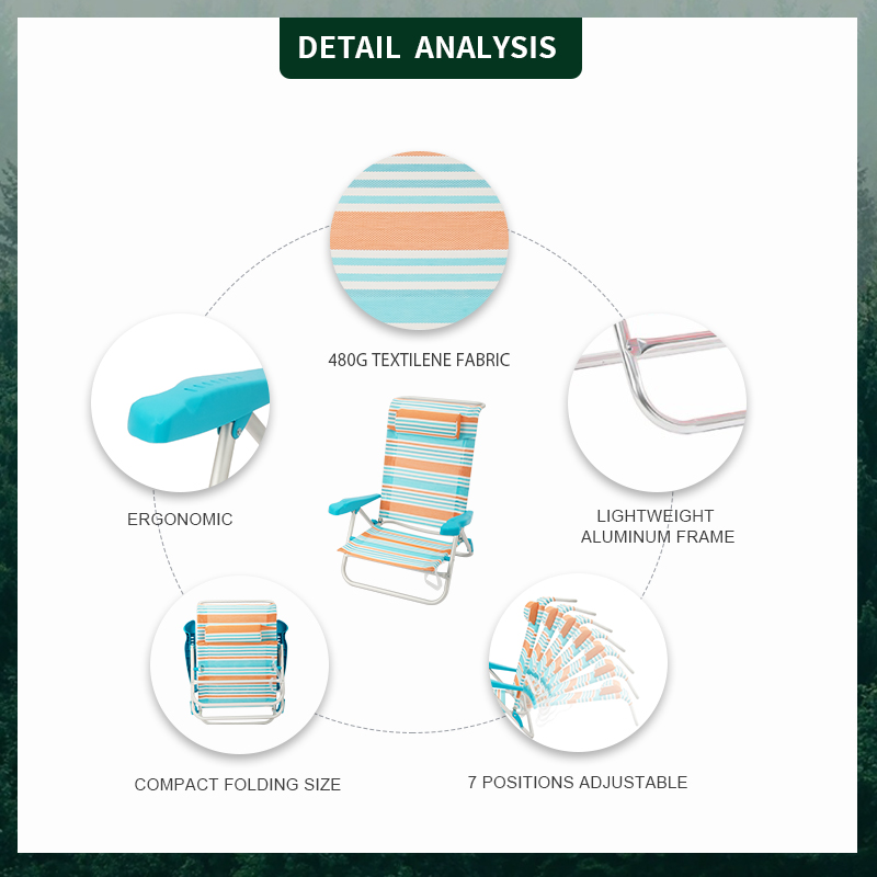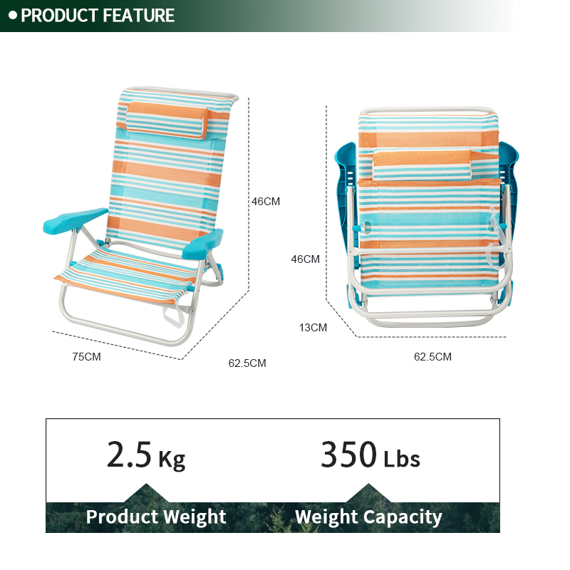 Settle in anywhere with the High Quality Dimensions Specifications Wholesale Factory Foldable Custom Folding Beach Chair. Lightweight aluminum frame, supports up to 350 lbs for lasting comfort. Thoughtful touches include adjustable armrests, quick-fold design, and compact fold. Packs into the included carry bag for grab-and-go convenience. Net weight 2.5 kg. Ideal for camping, events, patios and parks.