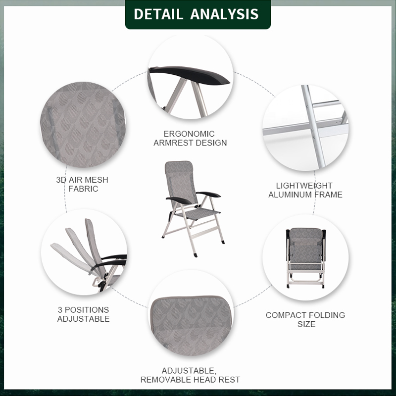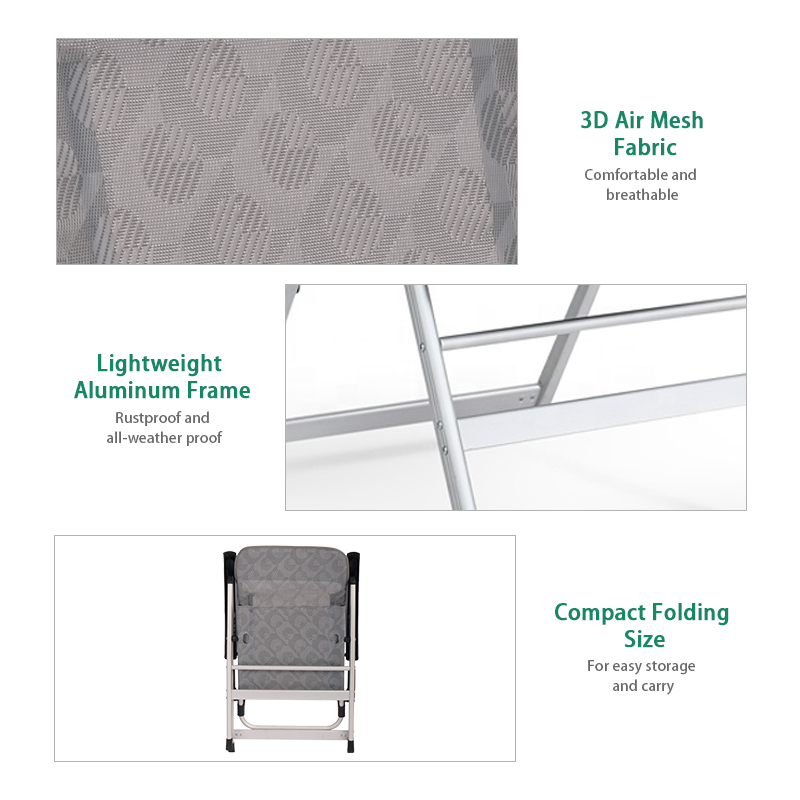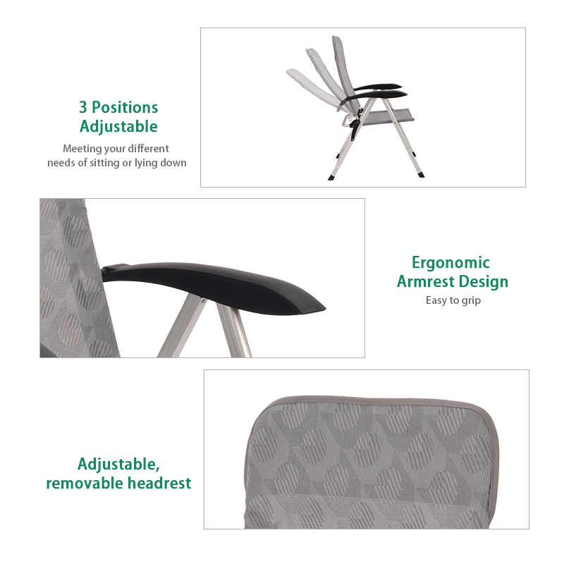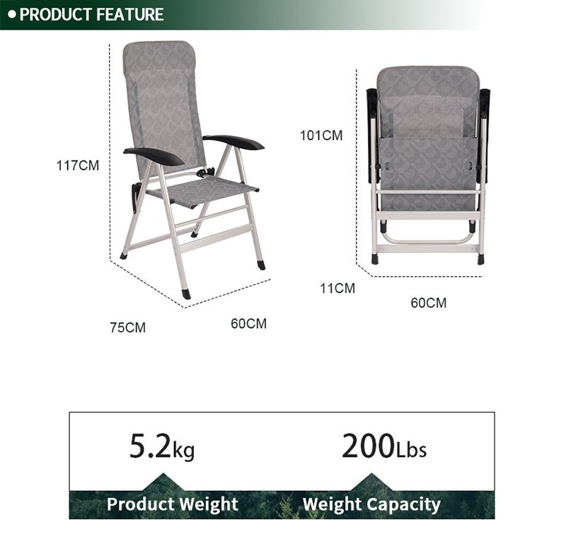 Different from the other folding chair, this chair has a novel design. Made of lightweight aluminum frame, rustproof and all-weather proof, and breathable and comfortable textilene fabric. Can hold up to 100 kg, the chair is made to withstand a lifetime of enjoyment. No assembly needed, easy to open and fold. It can be folded in a very compact size for easy transportation and storage. With 7 reclining positions, ergonomic design and head support.