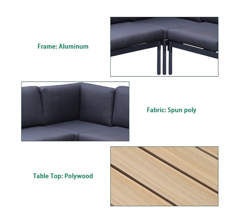 Lightweight aluminum frame is easy to move while remaining corrosion resistant. Spun poly fabric is soft yet durable, designed specifically for outdoor performance. Polywood table top provides the look of wood without the need for sanding or sealing. Complete seating group creates a comfortable lounge zone for family and guests.
