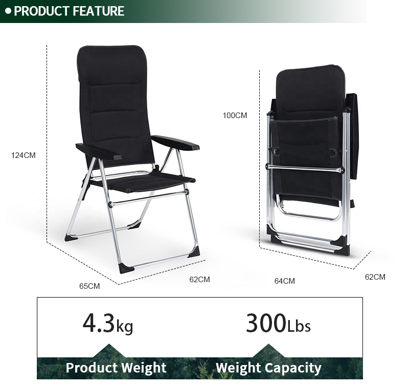 Settle in anywhere with the OEM 5 Position Adjustable Reclining High Back Aluminum Lightweight Outdoor Folding Camping Chair For Picnic. Lightweight aluminum frame, breathable mesh panels, supports up to 300 lbs for lasting comfort. Thoughtful touches include adjustable armrests, quick-fold design, and breathable mesh. Packs into the included carry bag for grab-and-go convenience. Net weight 4.0 kg. Ideal for camping, events, patios and parks.