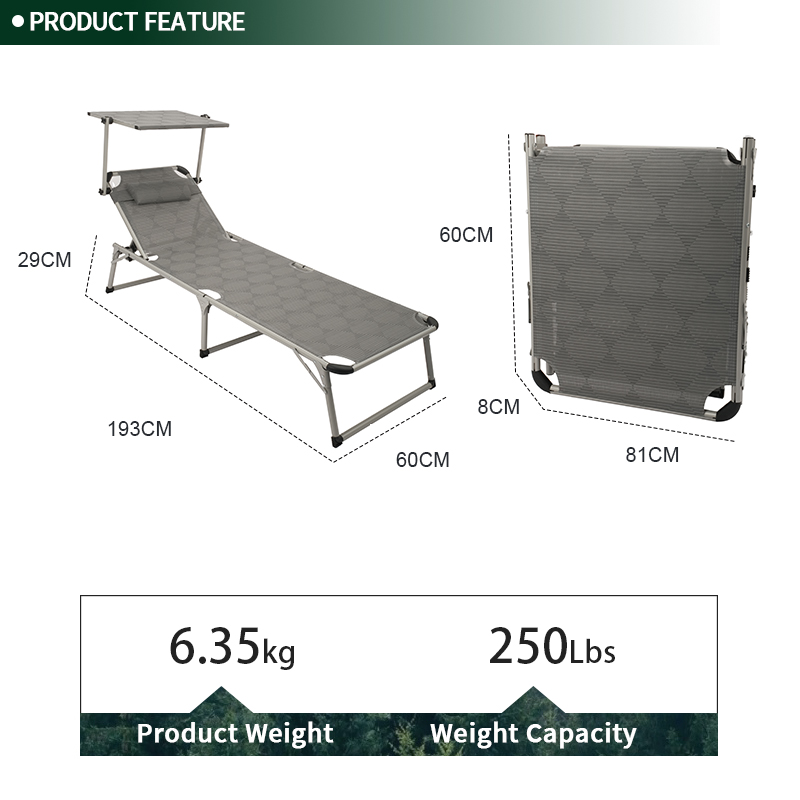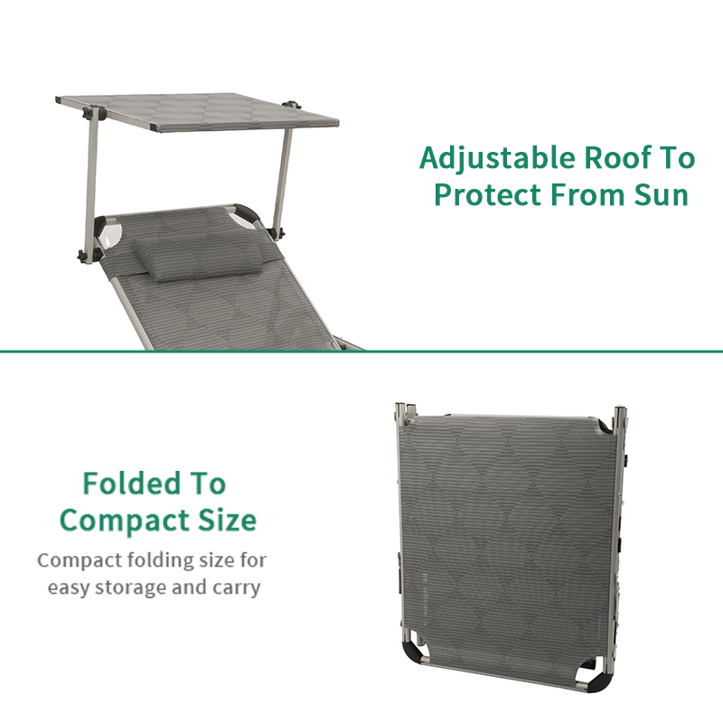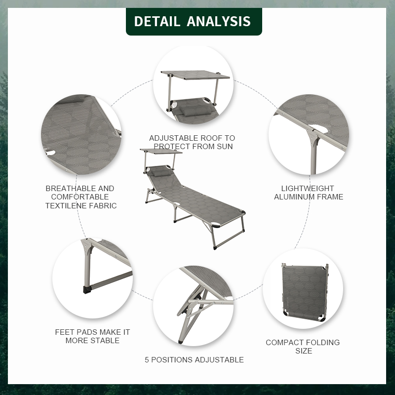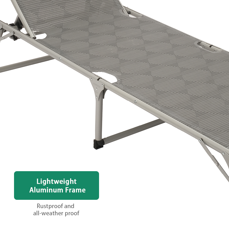 Settle in anywhere with the Outdoor Furniture Foldable Picnic Beach Garden Pool Chair Adjustable Sun Bed Sun Lounger with Headrest. Lightweight aluminum frame, supports up to 400 lbs for lasting comfort. Thoughtful touches include multi-position reclining, quick-fold design, and compact fold. Packs into the included carry bag for grab-and-go convenience. Net weight 6.7 kg. Ideal for camping, events, patios and parks.