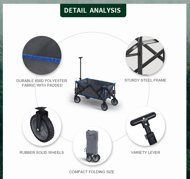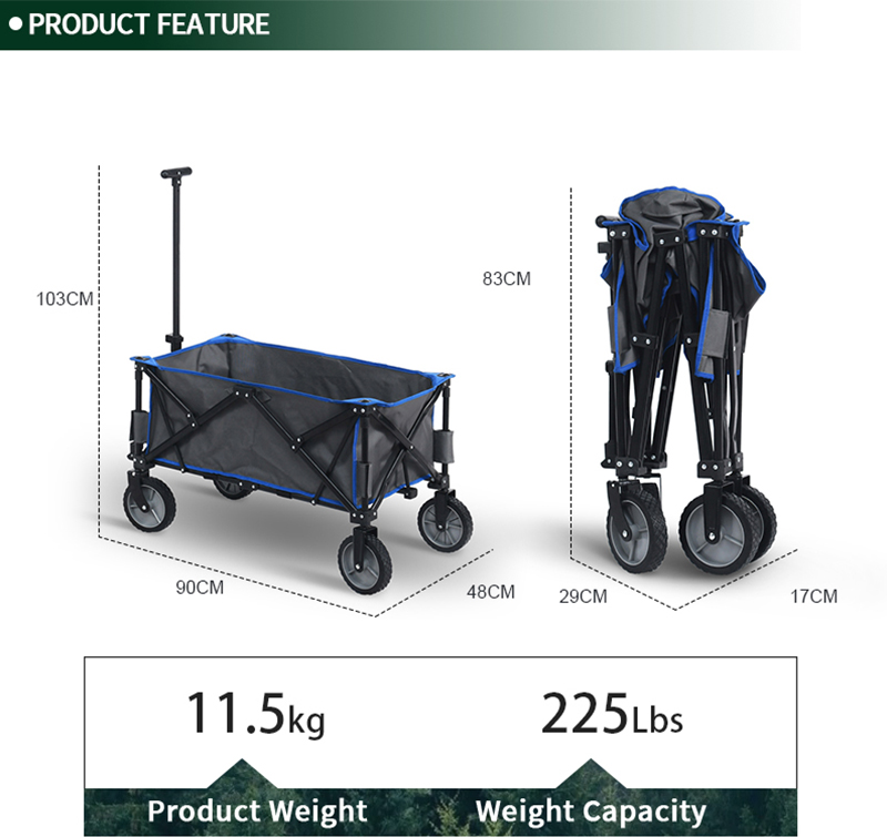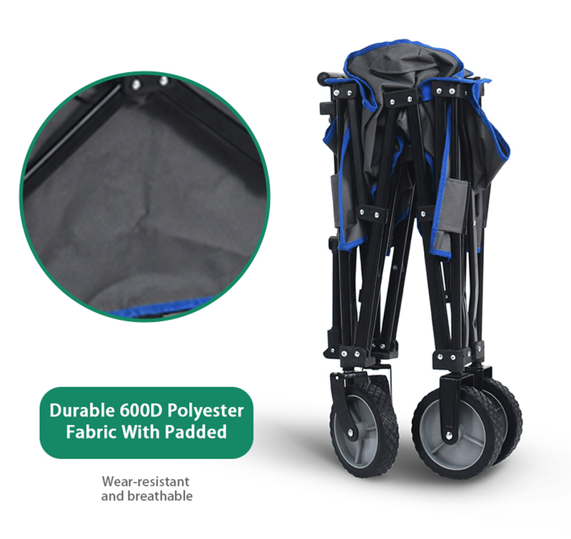 Settle in anywhere with the Outdoor Garden Park Utility Portable Beach Trolley Cart Camping Foldable Folding Wagon. Breathable 600d polyester oxford, powder-coated steel frame, supports up to 260 lbs for lasting comfort. Thoughtful touches include quick-fold design and compact fold. Packs into the included carry bag for grab-and-go convenience. Net weight 9 kg. Ideal for camping, events, patios and parks.