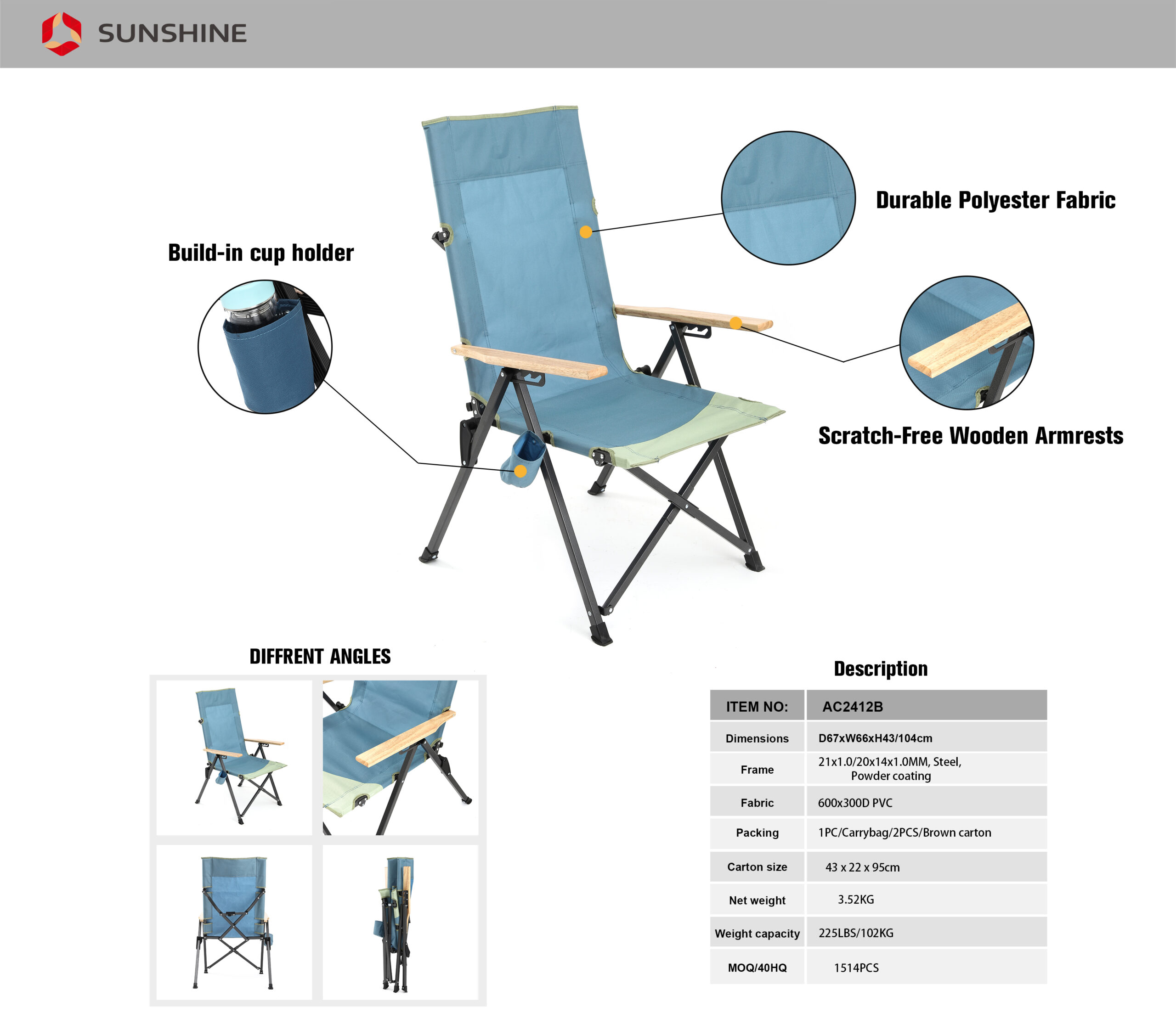 Settle in anywhere with the Oversize Portable Steel Tube Lazy Chair High Back Camping Folding Chair. Breathable 600d polyester oxford, powder-coated steel frame, smooth wooden armrests, supports up to 300 lbs for lasting comfort. Thoughtful touches include adjustable armrests, wooden armrests, and quick-fold design. Packs into the included carry bag for grab-and-go convenience. Net weight 3.5 kg. Ideal for camping, events, patios and parks.