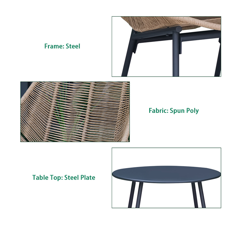 Powder-coated steel frame provides strong support and rust resistance for outdoor use. Spun poly fabric is soft yet durable, designed specifically for outdoor performance. Space-saving dining layout is ideal for alfresco meals on patios, balconies, or gardens.