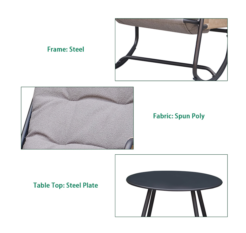 Powder-coated steel frame provides strong support and rust resistance for outdoor use. Spun poly fabric is soft yet durable, designed specifically for outdoor performance. Space-saving dining layout is ideal for alfresco meals on patios, balconies, or gardens.