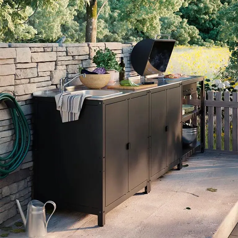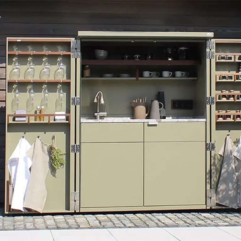 Individual flat-pack units, such as the sink unit, kitchen cabinet, and grill section, can be purchased separately and easily assembled and set up on a patio or terrace to suit the layout.